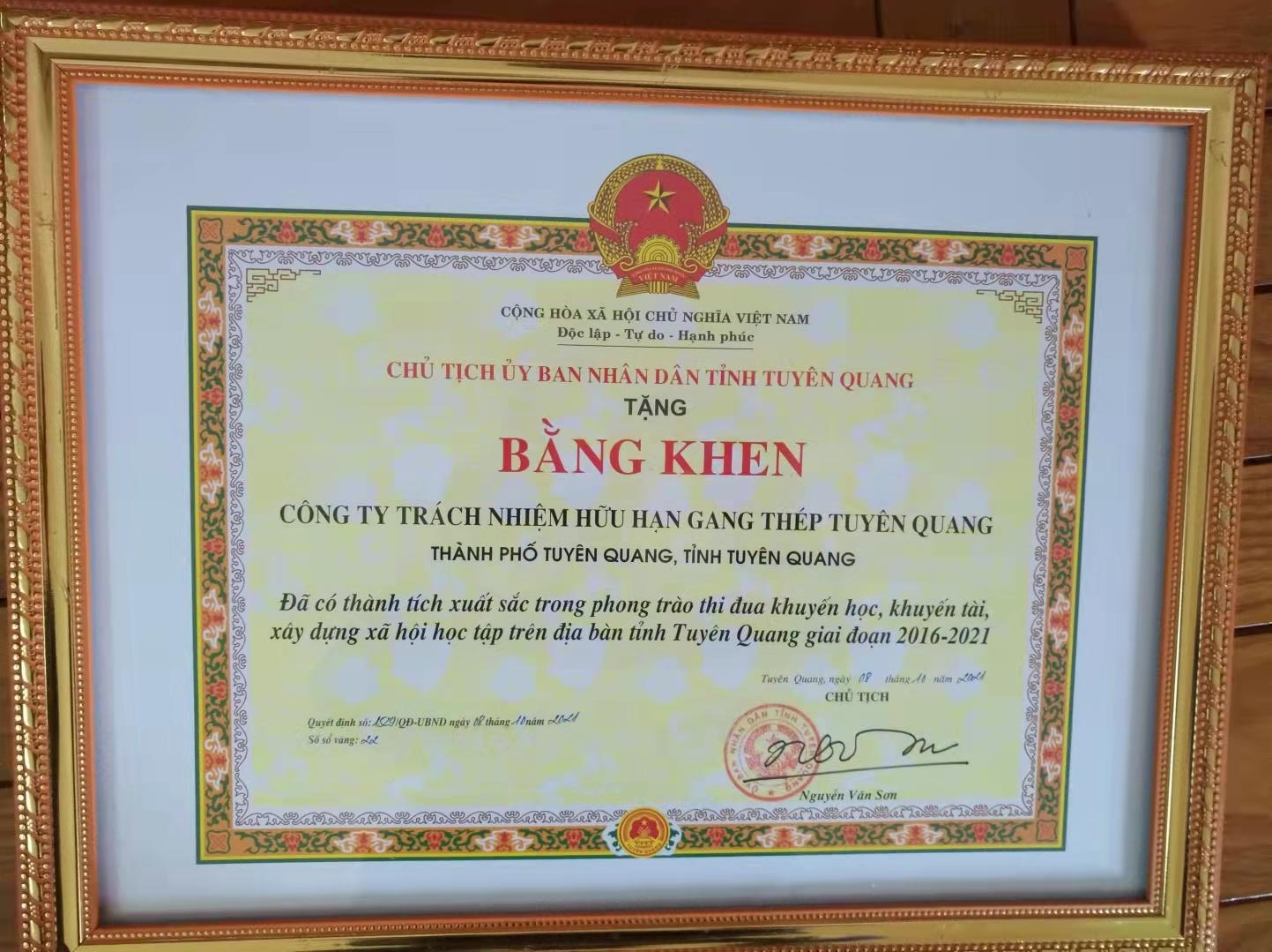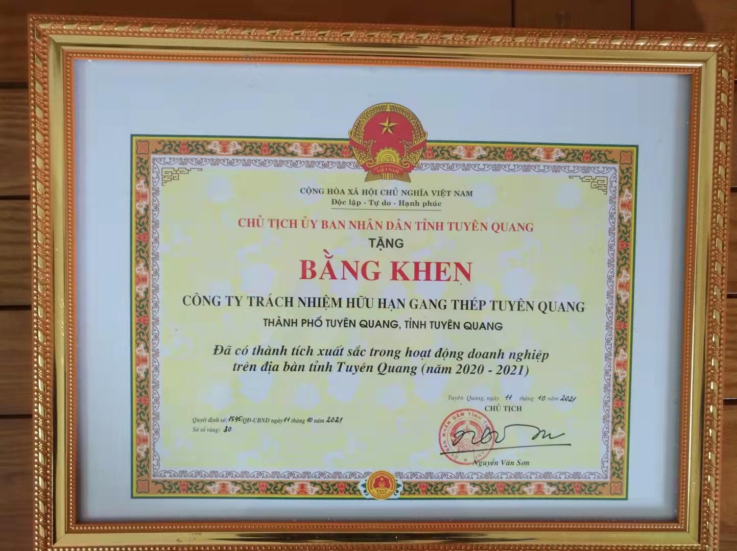 越南宣光省政府頒發(fā)的省長(zhǎng)獎(jiǎng)狀一,旨在獎(jiǎng)勵(lì)宣光鋼鐵有限責(zé)任公司在宣光?。?020年—2021年)企業(yè)活動(dòng)中取得優(yōu)異成績(jī);越南宣光省政府頒發(fā)的省長(zhǎng)獎(jiǎng)狀二,旨在獎(jiǎng)勵(lì)宣光鋼鐵有限責(zé)任公司在宣光省2016年—2021年度的社會(huì)建設(shè)學(xué)習(xí)、勸學(xué)、助才競(jìng)賽活動(dòng)中成績(jī)優(yōu)異。前兩份獎(jiǎng)狀均由越南宣光省省長(zhǎng)阮文山簽字。越南宣光省勞動(dòng)聯(lián)合執(zhí)委會(huì)頒發(fā)的獎(jiǎng)狀三,旨在獎(jiǎng)勵(lì)宣光鋼鐵有限責(zé)任公司為工會(huì)創(chuàng)造活動(dòng)條件,關(guān)心、照顧勞動(dòng)者上成績(jī)突出。該獎(jiǎng)狀由宣光省勞動(dòng)聯(lián)合執(zhí)委會(huì)主席阮秋水簽字。? ? ??